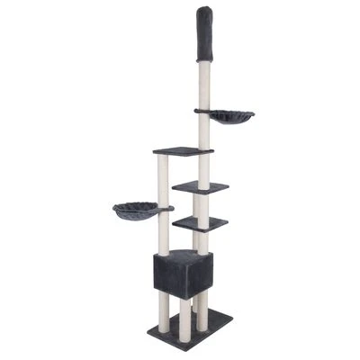 This ceiling-high cat tree has everything your cat could desire: a cosy den for snoozing, two extra large hammocks with a diameter of 40cm, and plenty of climbing platforms and scratching posts. Your cat will love sleeping cosily in the two huge hammocks, or simply relaxing and enjoying the view from up high.