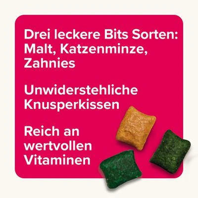 Crunchy snack for cats, mix with 3 delicious varieties: Malt Bits with malt paste against hairballs, Catnip Bits with catnip, Toothies crunchy pockets to support dental care, crispy baked