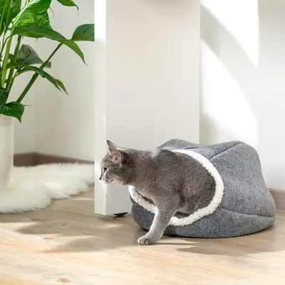 The Cosma Cat Den is made from hard-wearing dark grey felt. It has a cosy pod shape and is a great place for your cat to retreat and enjoy some down-time. The inside is covered in soft, white plush material and has a padded base to make it extra comfy. The rounded, enclosed shape will make your cat feel protected and safe. The den is made from easy-to-care-for material and can be washed in the washing machine on a gentle cycle up to 30°C. The dark grey felt outer has plush edging to match the inside and the subtle colours will suit all décor and colour schemes.