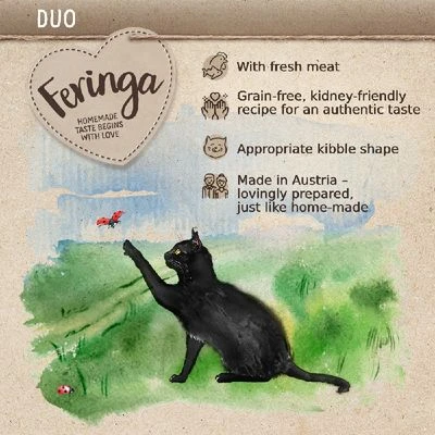 Our Feringa complete dry cat food is of the highest quality. It is made with lots of fresh meat or fish, lovingly combined with local vegetables or fruit and fine herbs. This grain-free complete dry cat food is full of flavour – and totally free from artificial colourings, flavourings or preservatives. It is produced with the greatest of care in Austria. The careful selected local ingredients are used to create exciting meals using only the listed ingredients – for a truely authentic taste.