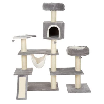 Large cat tree with spacious den, with a hammock, two cuddle beds and lookout platforms, with a handy ladder to climb, covered in scratching mat, ideal for larger cats or multi-cat households.