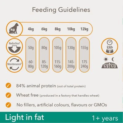 Reduced-fat kibble for adult cats struggling with their weight, with a high content of animal protein to keep muscles strong whilst achieving a healthy weight, with key nutrients for health.