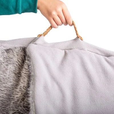 Cosy cuddle den for cats & small dogs, retreat for hiding & sleeping, with integrated, removable blanket, cuddly long hair plush, decorative carrying handle, colour: grey