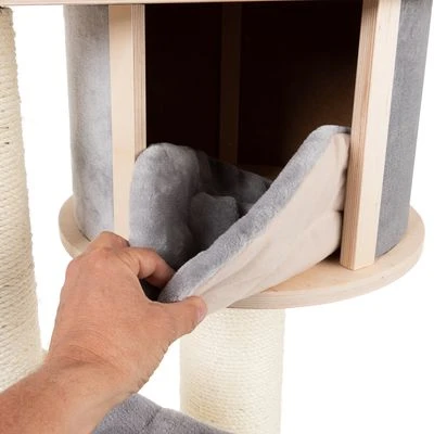 Large scratching tree with real wood plates from sustainable materials, forestry and extra thick sisal posts, ideal for larger cats and with removable, washable, Oeko-Tex® certified sleeping spaces.