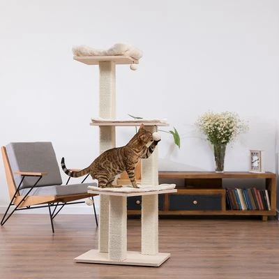 - High-quality cat tree with solid scratching posts and padded platforms with cuddly lookout