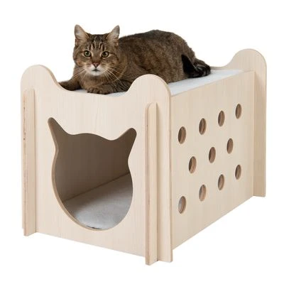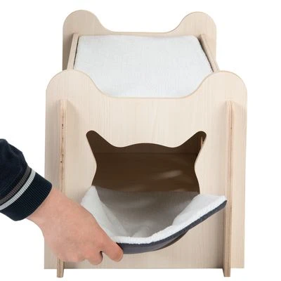 Double-storey cat bed made from wood, with 2 comfortable laying surfaces and padded reversible cushion.