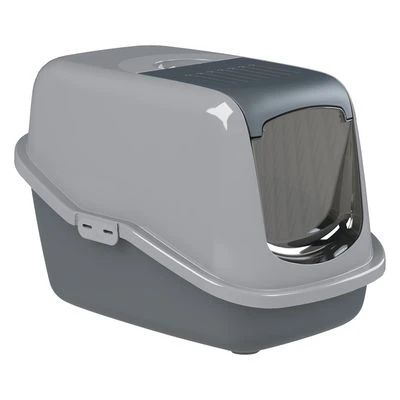 - Hooded litter tray for cats with a litter scoop and environmentally friendly wood litter