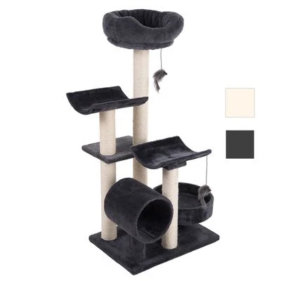 A stunning cat tree with different levels for playing, sleeping and stretching, with 5 sisal posts. Also suitable for kittens, large breeds and elderly cats. Dimensions: 55 x 40 x 116 cm (L x W x H)
