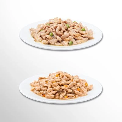 Balanced wet food for senior cats over 7 years old, with two tasty flavour varieties rich in nutritious vegetables, offering key vitamins, minerals and essential taurine, with quality ingredients.