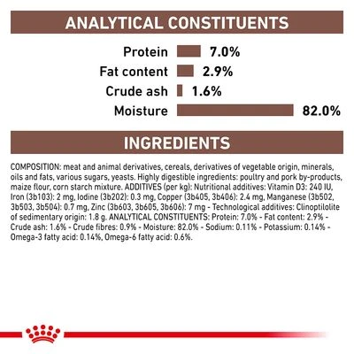 The fermentable fibres (FOS) in this wet food help keep your cat’s digestive system working regularly, while simultaneously supporting a balanced intestinal flora. The protein content has been formulated to be easily digestible, so the stomach and intestine are not overloaded. Common side effects of gastrointestinal disorders are weight loss and loss of appetite. Royal Canin Veterinary – Gastrointestinal Moderate Calorie wet food offers a highly palatable flavour to satisfy any decreased appetites, while the EPA and DHA long-chain fatty acids offer support to the digestive system.