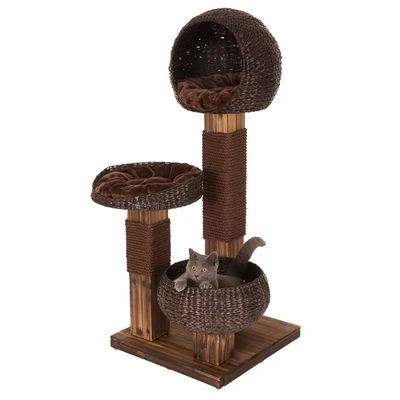 An elegant cat tree with a contemporary “burned” wood effect. It has solid wood cladding and the beautiful water hyacinth baskets have washable cushions. Dimensions: 58 x 58 x 139 cm (L x W x H).