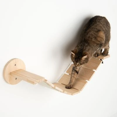 A hanging suspension bridge for cats made of solid pine. Wall-mounted to save on floor space, with 9 planks attached to durable webbing. An ideal addition to a wall obstacle course.Â