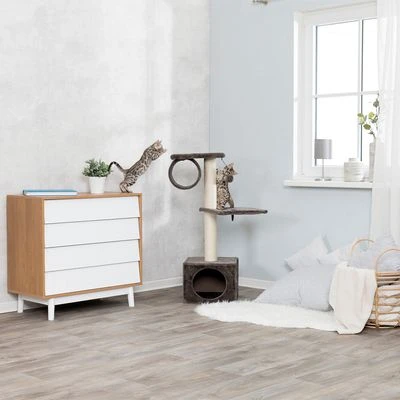 Space-saving and still versatile? That’s possible! The Trixie San Fernando cat tree offers your pelt-noses a whole adventure playground in a small area with its diverse range of lying areas and hiding places – in addition to the integrated claw care station. Of course, it also has a strong scratching post made of robust sisal: perfect for daily claw sharpening and long stretches! If your darling wants to relax afterwards, there are four cosy places to choose from.
