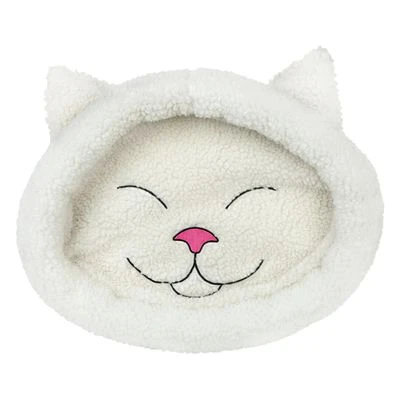 Lovely padded snuggle bed made from ivory lambs fleece style plush in a fun cat’s face design, with embroidered features and cat ears. Especially soft and comfy. Wash at 30°C